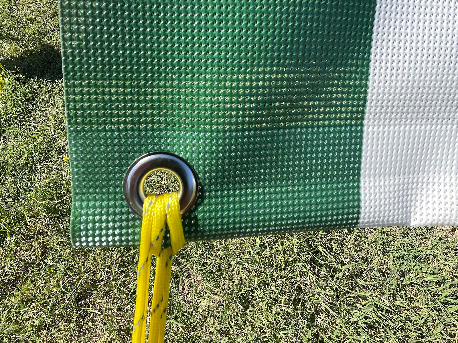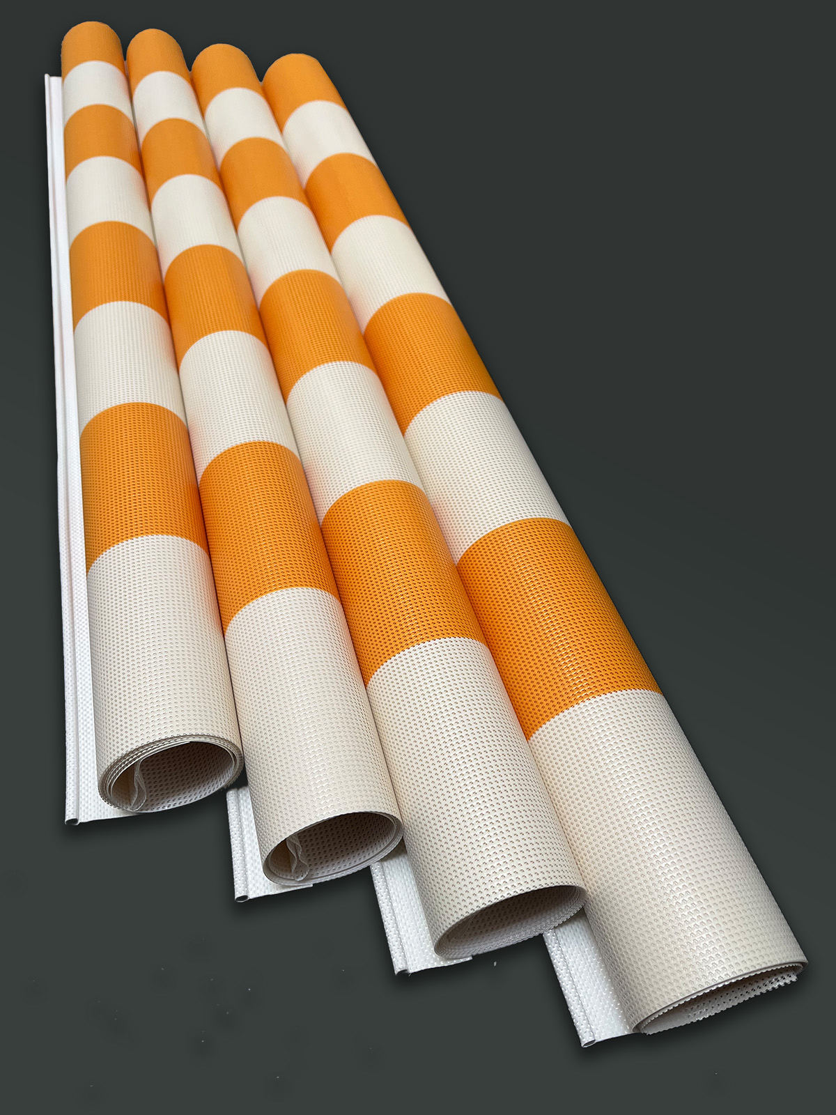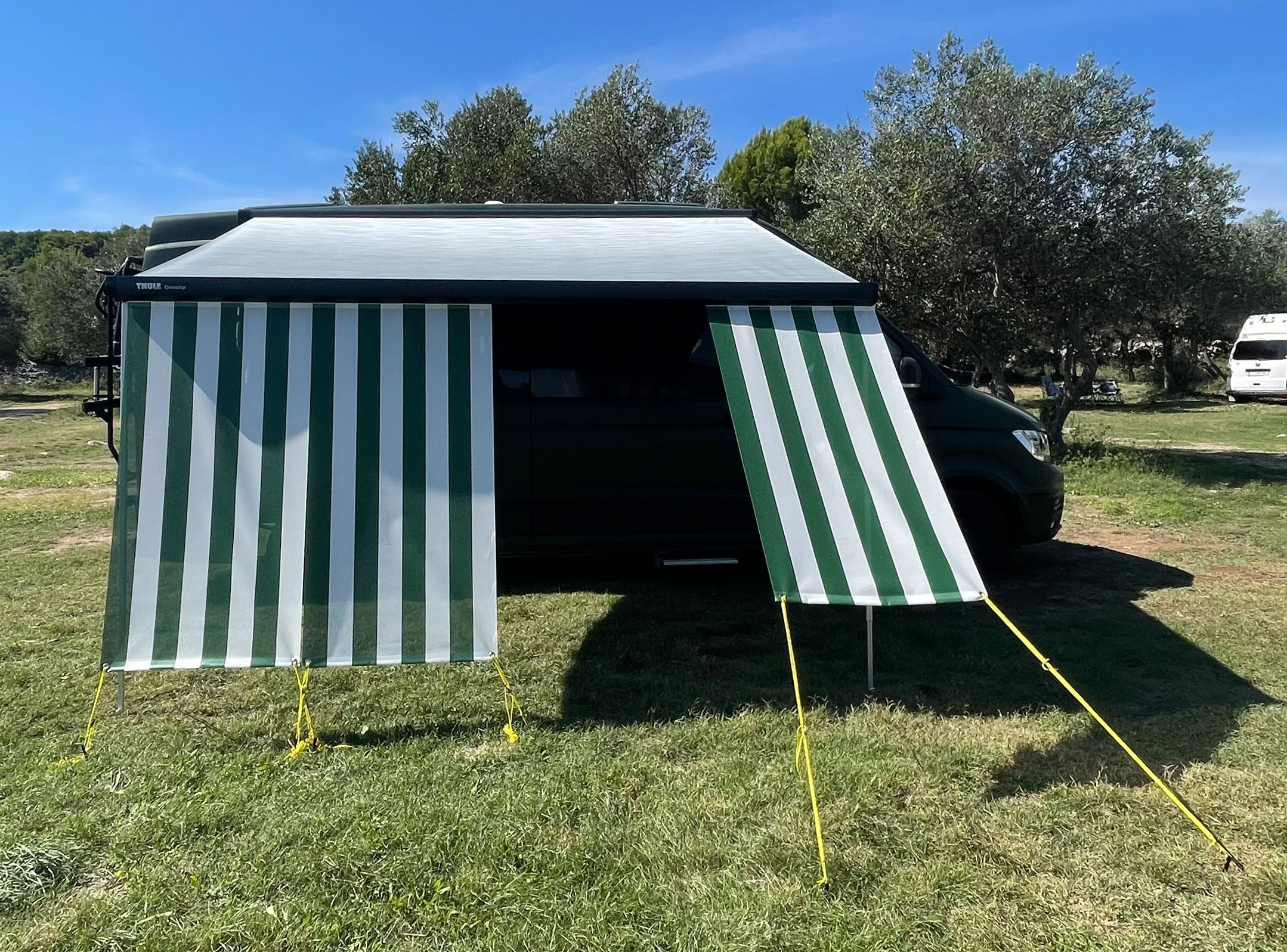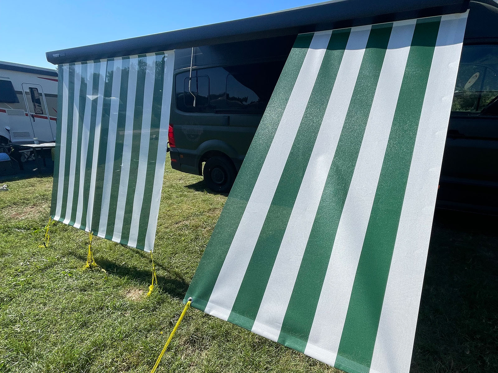 Die einzelnen Module die einseitig in Blockstreifen bedruckt sind, lassen sich senkrecht oder auch in einem flacheren Winkel spannen. Damit kann man einen Durchgang für den Camper oder auch unterschiedliche Funktionen (Sicht- oder Sonnenschutz) erzeugen. Die Segel lassen sich einfach mit dem fest eingeschweissten Keder in alle gängigen Thule Omnistor Markisen einziehen. Gespannt wird an 2 Metallösen die jeweils an jedem Segel installiert sind.