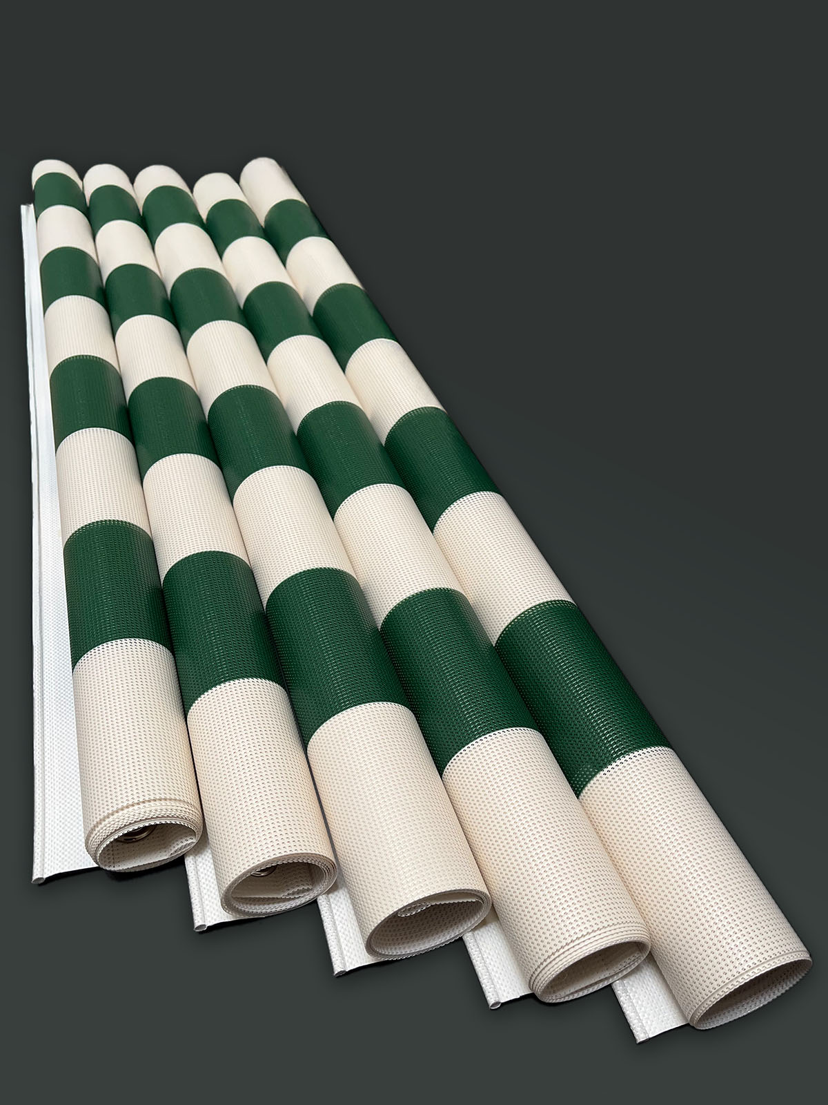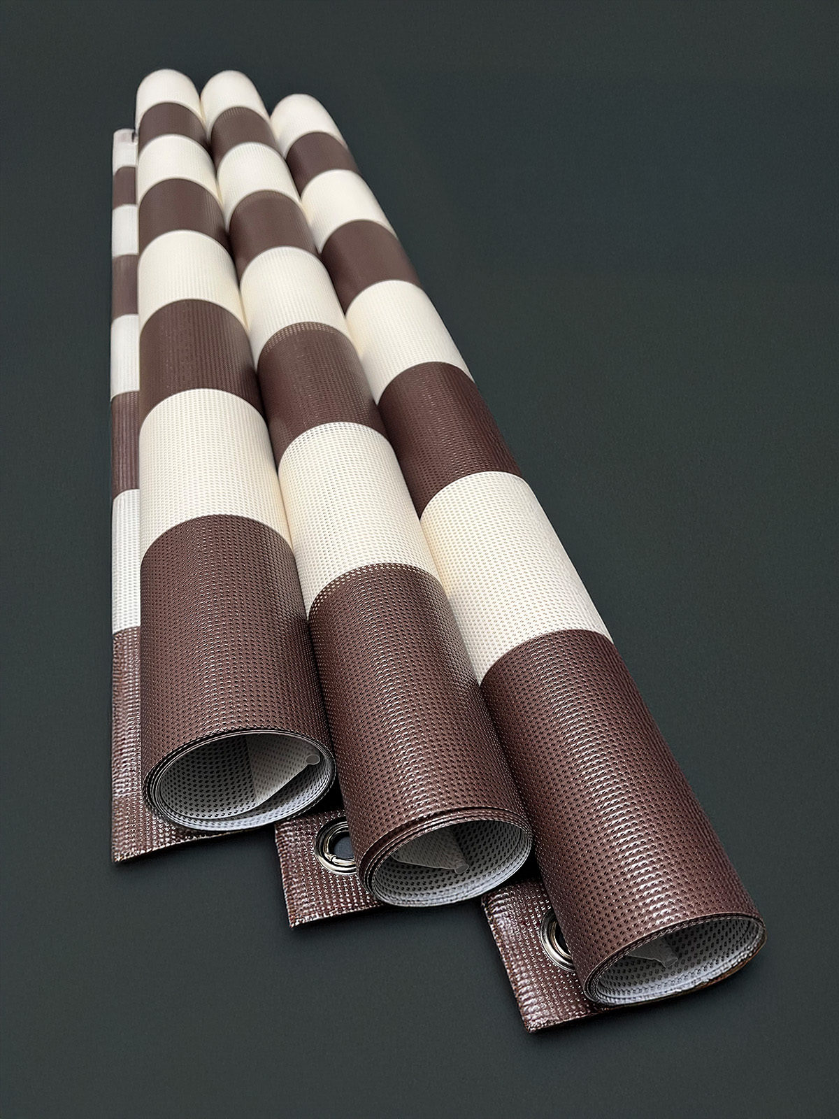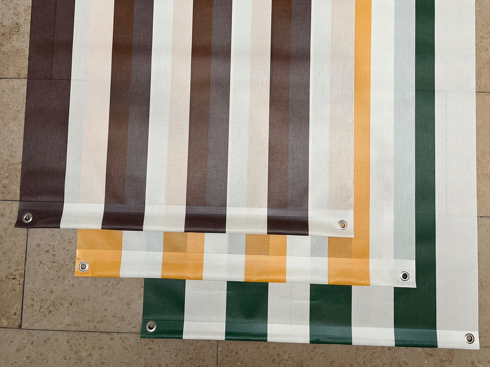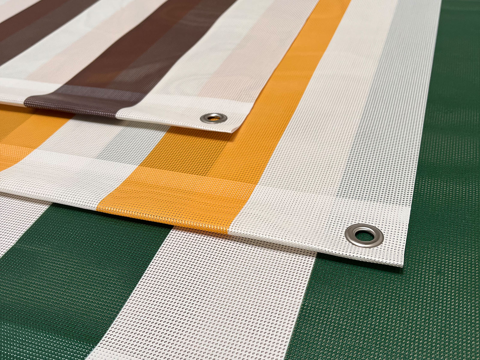 Wir bieten 3 Farben (camposy Sonnengelb / Braun / Dunkelgrün auf Grundfarbe Creme) als aussenseitigen Druck an; Weiterhin kann man für die unterschiedlichen Markisenbreiten jeweils 3er, 4er oder 5er Packs bestellen.